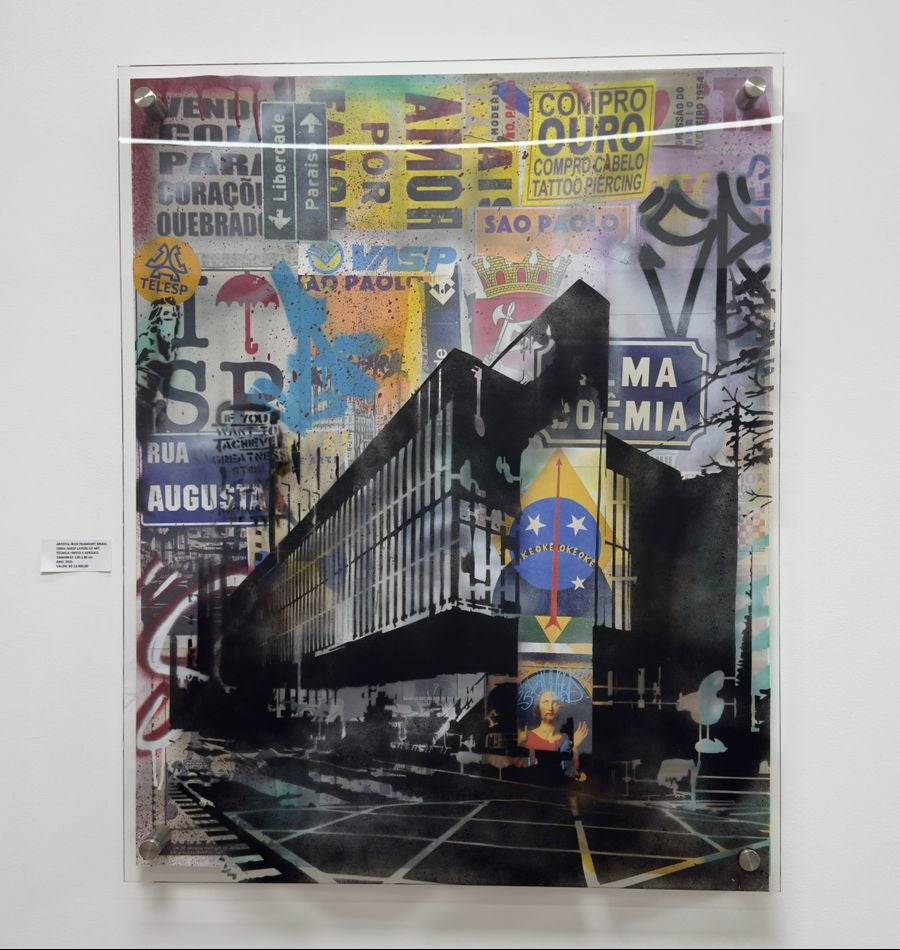 ACRILICO 8 MM A FRENTE DA OBRA. TELA ATRAS DO ACRILICO SPRAY CANVAS E COLAGENS.